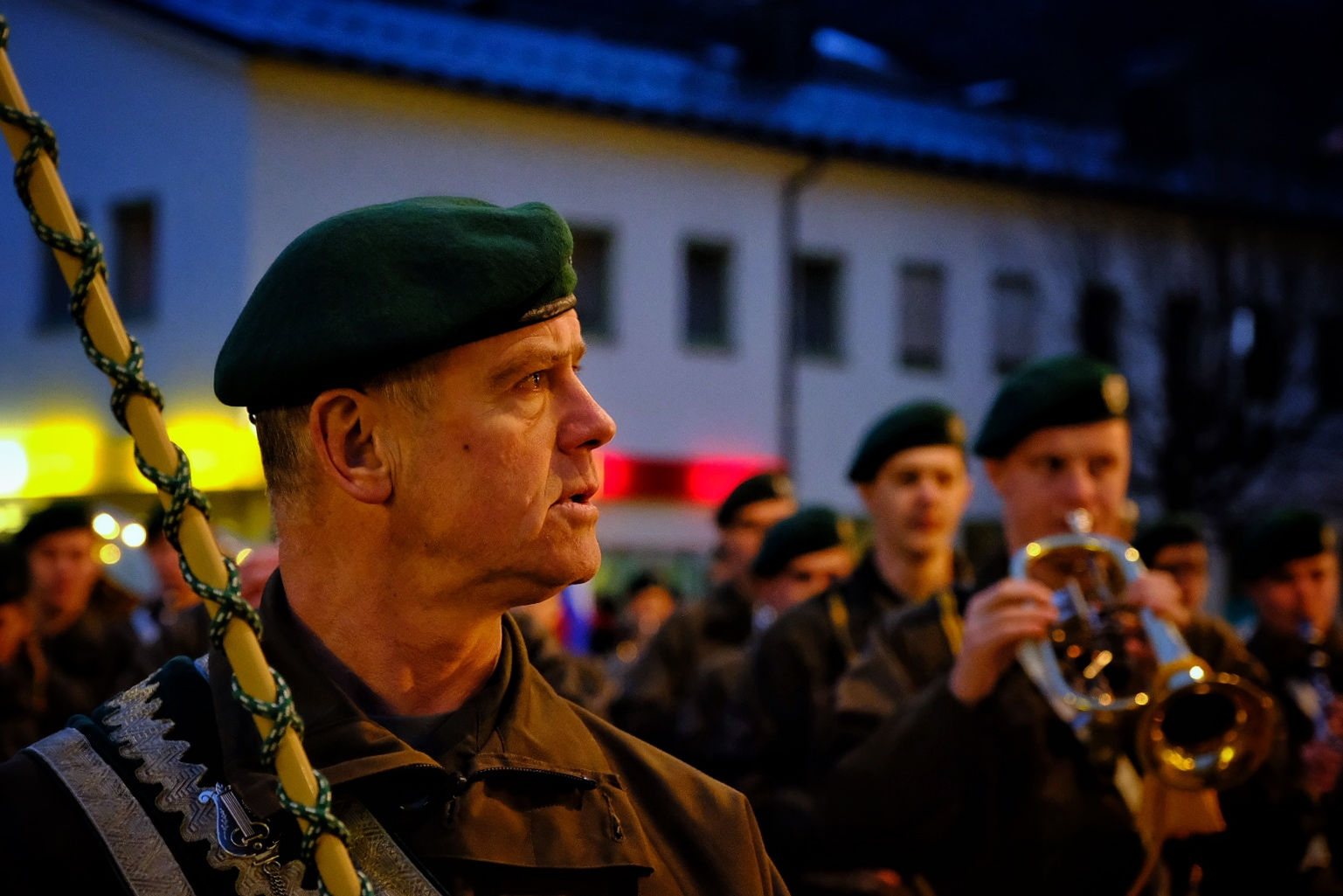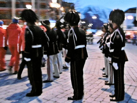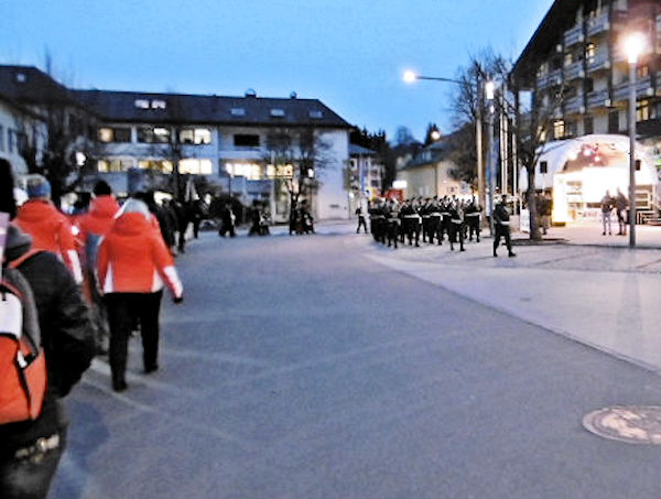The competitors lined up in their Team uniforms behind the young Austrian who carried the name of the country and the National Flag was carried by a competitor. We marched through the town to the Centre behind a military band and a squad of soldiers in authentic dress uniform from a previous era: they were accompanied by two women in National dress whose job was to carry the ceremonial schnapps to serve to their officers and guests.