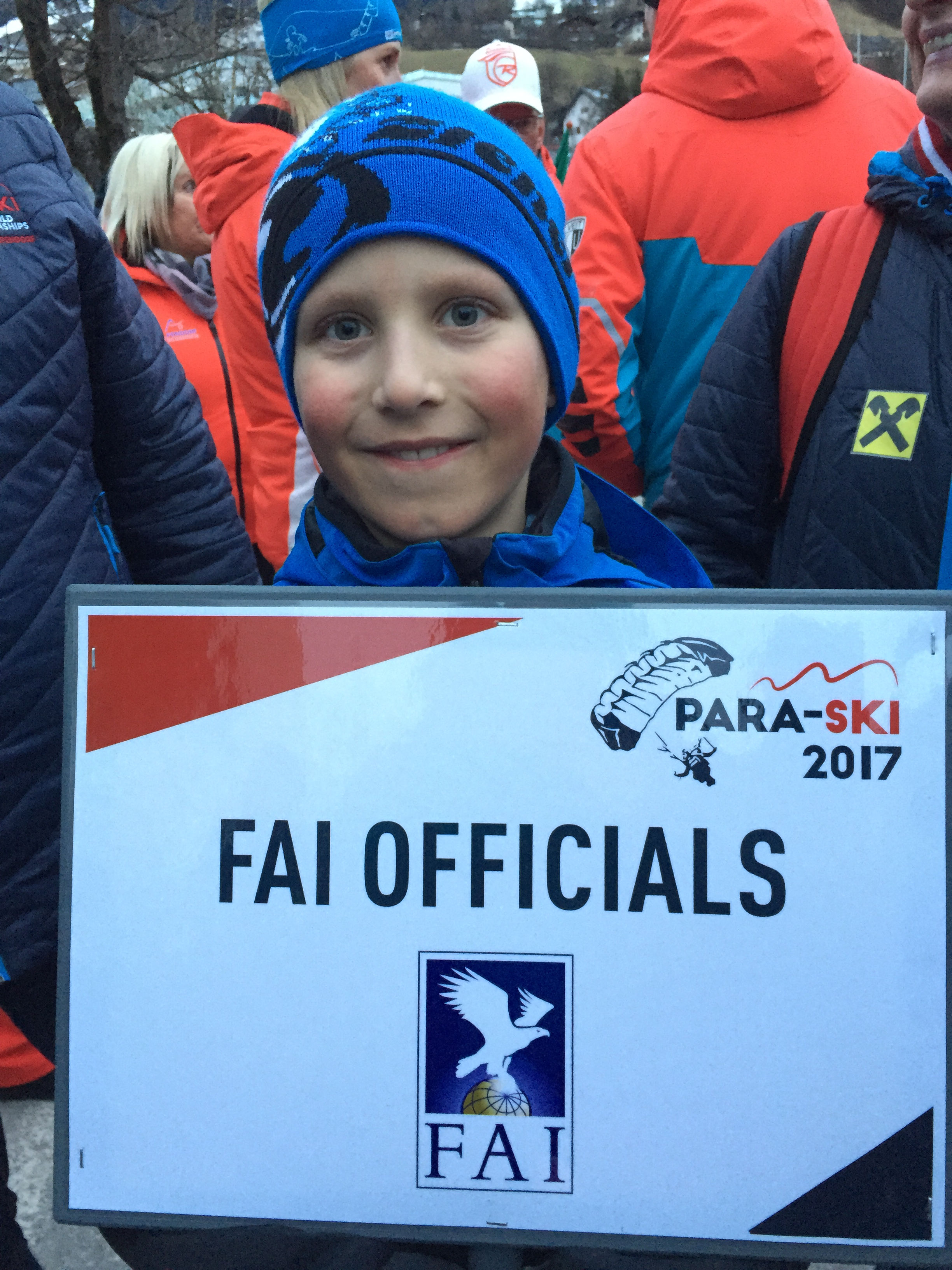 Yesterday evening the formal Opening Ceremony of the 16th World Para-Ski Championships took place in the Town Centre of St Johann and started with the arrival of the FAI Flag - flown very spectacularly into the arena by the HSV Red Bull Austria Demo team. For a moment it looked as if the flag was being burnt, but it was only the amazing sight of the parachutist flying with the both the flag and a firework. The other team members had red lights beneath them.
