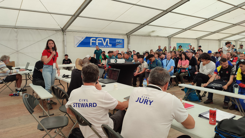The first day of the championship started with registration followed by the mandatory safety and team leaders briefings where the main issues of the local rules were addressed. The Meet Director Jacques Fournier, the Safety Director Joel Favre, and the scorer Ulric Jessop answered the questions. They were assisted by FAI CIVL Steward Goran Dimiskovski. FAI Jury: Zeljko Ovuka, Ivan Lukanov, and Bill Hughes were also present at the meeting and took notes.