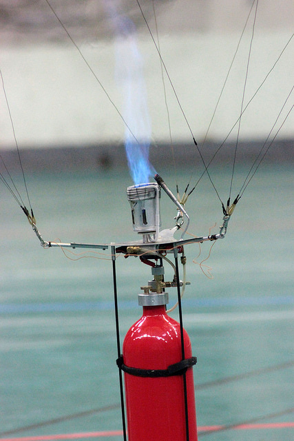 Bilquey built the model himself: the basket comprised a single commercial aluminium bottle with two valves (a pilot burner and burner), a safety valve and a purging air valve. The burner was controlled by a solenoid valve actuated by a Bec-ESC. The model weighed a total of 4.423kg.
