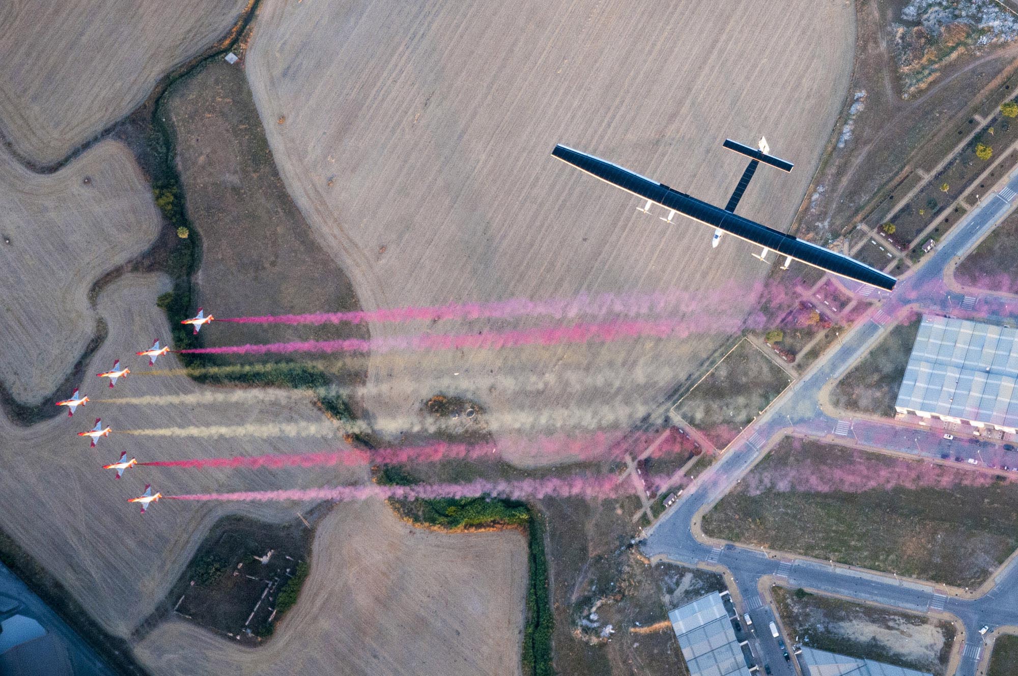 The landing in Spain was welcomed by the Eagle Patrol of the Spanish Air Force.